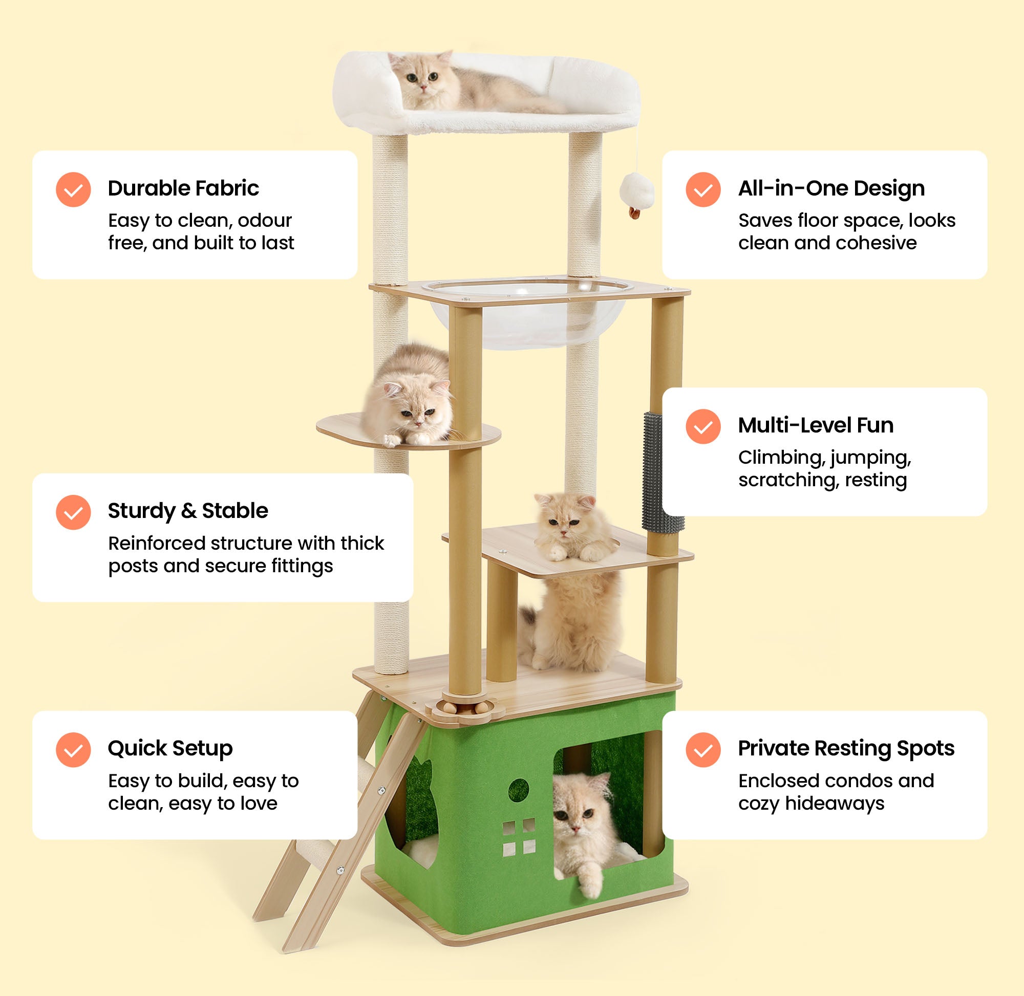 Why juggle scratching posts, beds, and play towers when one tree does it all? Strong enough for four cats, designed for climbing, scratching, and curling up—it’s a complete home for every paw.